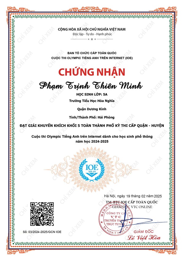 - Đỗ Hoàng Minh Trang: Đạt giải Khuyến Khích khối 5 toàn Thành Phố