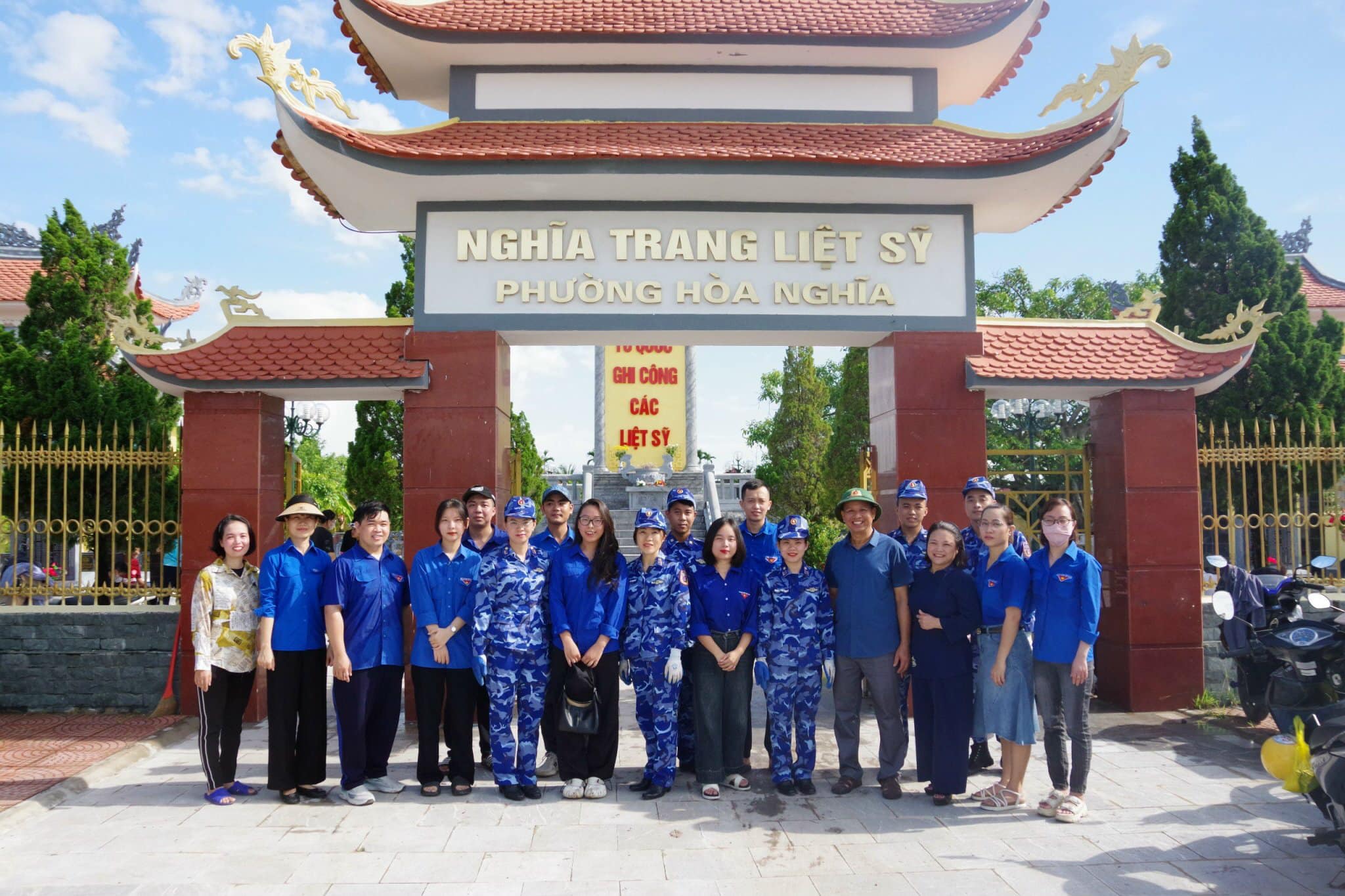 Nhằm nâng cao nhận thức, ý thức, trách nhiệm của mỗi đoàn viên, thanh niên, học sinh về bảo vệ môi trường, thực hiện nếp sống văn minh, hưởng ứng kế hoạch Chiến dịch Thanh niên Tình nguyện hè năm 2024, sáng ngày 21/7/2024, Đoàn thanh niên phường phối hợp với Trường THCS phường Hoà Nghĩa, đơn vị Đoàn đặc nhiệm PCTP Ma túy số 1 - BTL Cảnh sát biển Việt Nam tổ chức cho các em học sinh, Đoàn viên thanh niên, Đoàn viên sinh hoạt 2 chiều tham gia hoạt động dọn dẹp, cắt cỏ, vệ sinh nghĩa trang liệt sỹ và tổ chức hoạt động “Hoa dâng mộ liệt sỹ” tại 273 phần mộ liệt sỹ.
