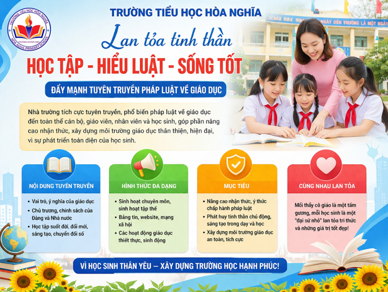 Thực hiện định hướng tuyên truyền của cấp trên, Trường Tiểu học Hòa Nghĩa tích cực triển khai công tác tuyên truyền, phổ biến các chủ trương, chính sách về giáo dục tới toàn thể cán bộ, giáo viên, nhân viên và học sinh.
