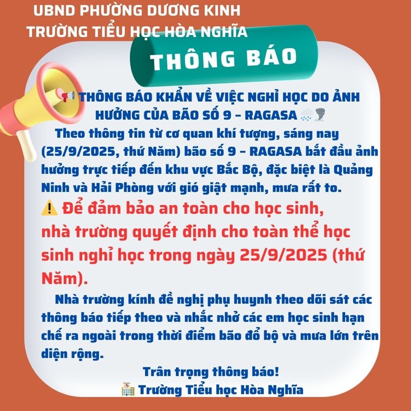 ⚠️ Để đảm bảo an toàn cho học sinh, nhà trường quyết định cho toàn thể học sinh nghỉ học trong ngày 25/9/2025 (thứ Năm).